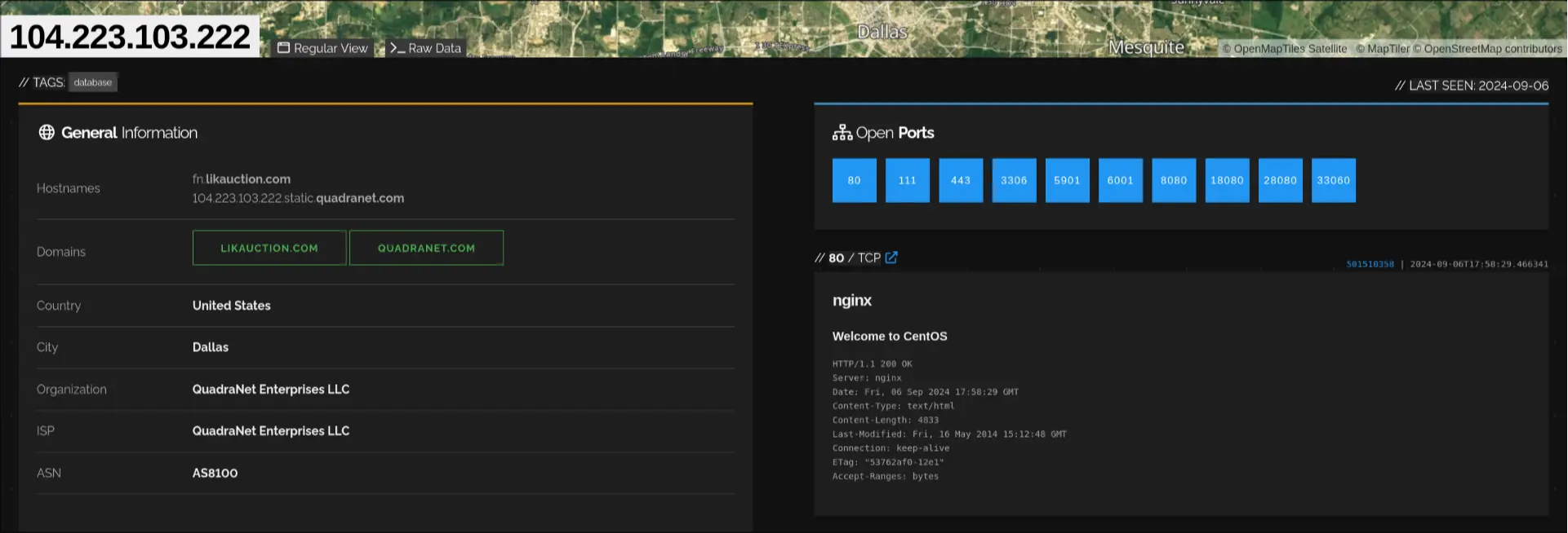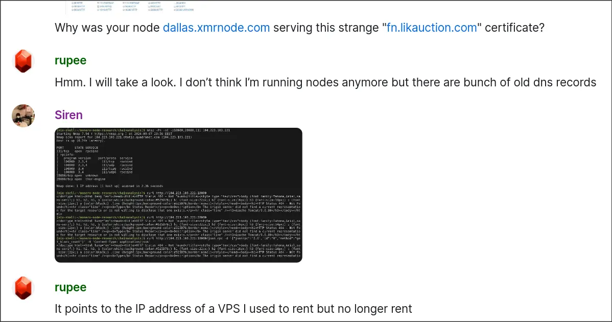 On 2024-09-05, Reddit user u/__lt__ made a post about the strange behavior they observed from one of the affiliated hosts after investigating node.moneroworld.com. The host in question is dallas.xmrnode.com (104.223.103.222). A port scan of it reveals that it has Monero node ports open alongside other services:
