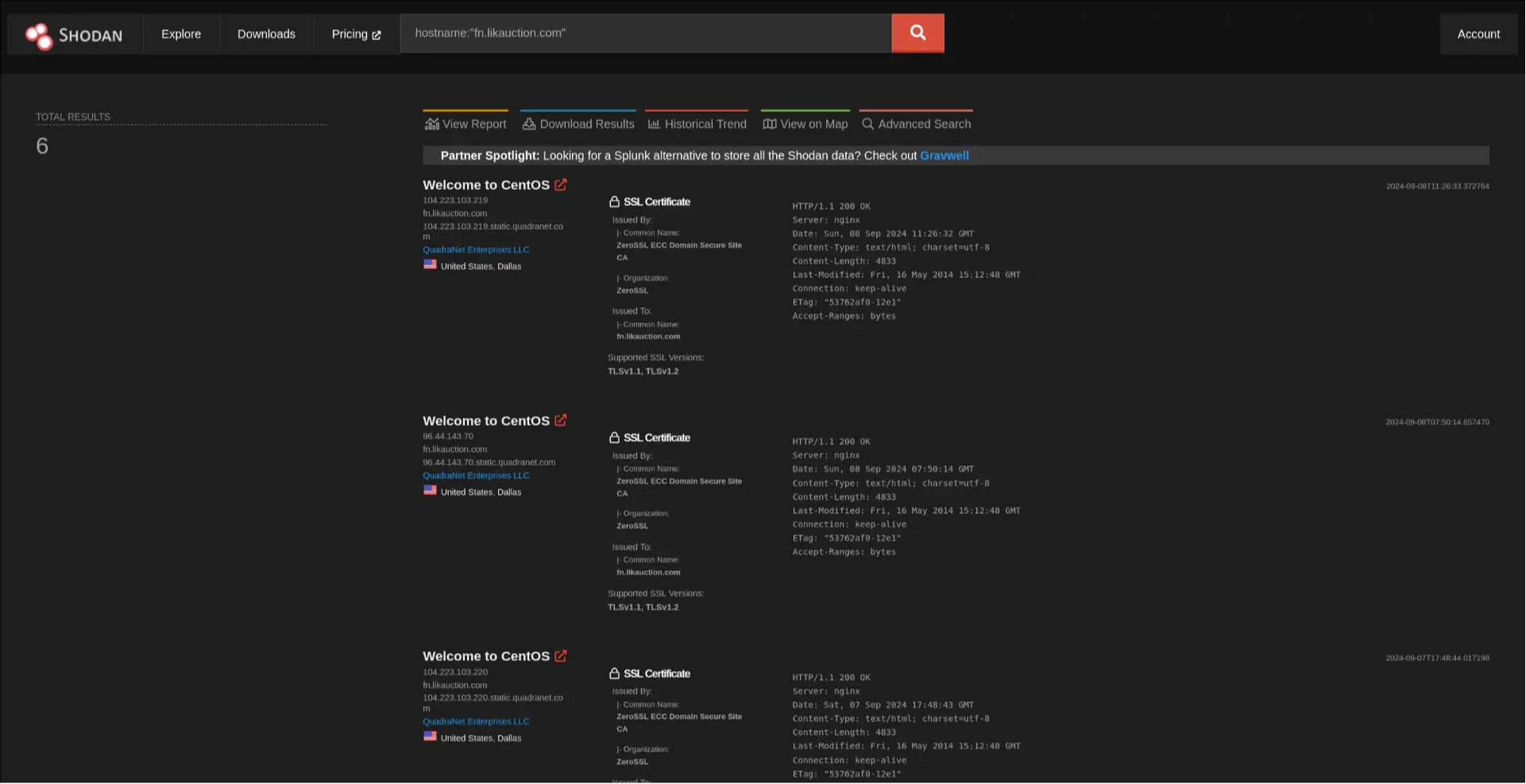 Nginx on port 443/tcp serves a self-signed certificate for fn.likauction.com. Searching for this hostname on Shodan leads to 6 different servers that have the exact same ports open.