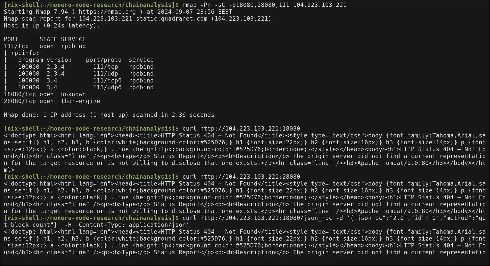 However as of writing, probing the Monero node ports on these servers reveals that these ports don't belong to nodes or Monero RPC servers. It could be that the malicious node operators have pulled the plug.