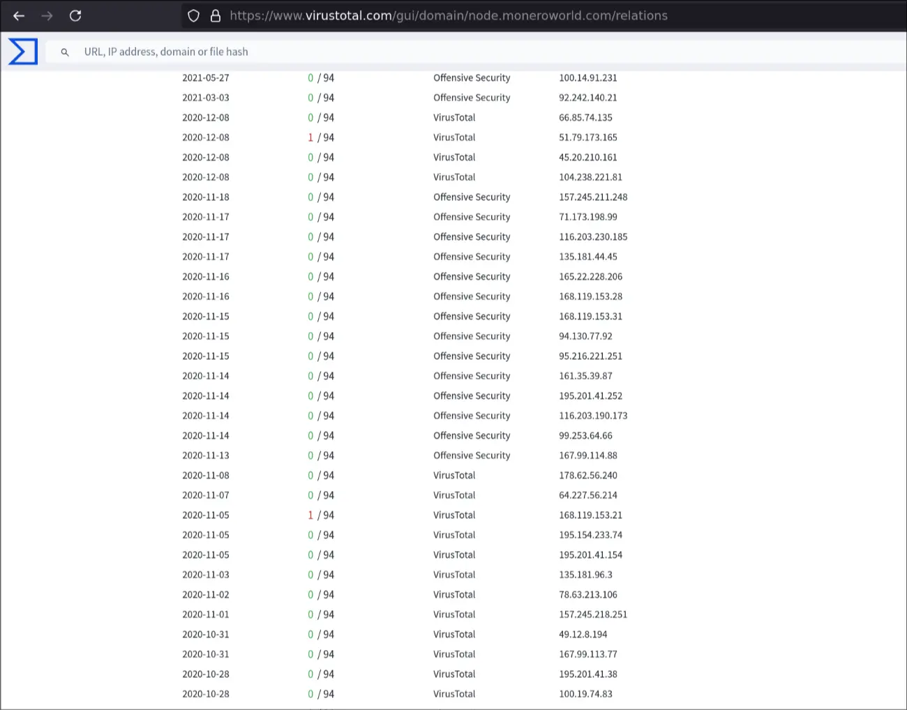 Based on the Source column, we can assume that node.moneroworld.com had A records pointing to at least two Chainalysis nodes (#003, #140) around 2020.