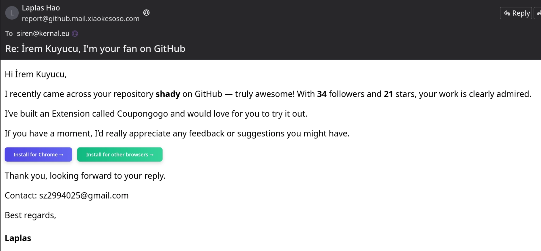 Our investigation began with a targeted social engineering attempt. I received an email that read: "Hi İrem Kuyucu, I recently came across your repository shady on GitHub — truly awesome! With 34 followers and 21 stars, your work is clearly admired. I've built an Extension called Coupongogo and would love for you to try it out."