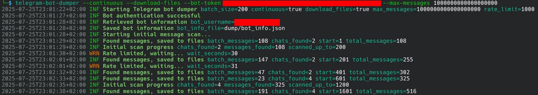 We now have a Telegram bot token and a chat ID. It isn't possible to access the message history of a bot using the Telegram Bot API. Luckily the Core Telegram API provides us with a method, and we were able to build our own tool for dumping chats and media from leaked bot tokens: github.com/digilolnet/telegram-bot-dumper. It also has the ability to listen continuously, which allowed us to see fresh credentials in real-time. Here is the tool in action: