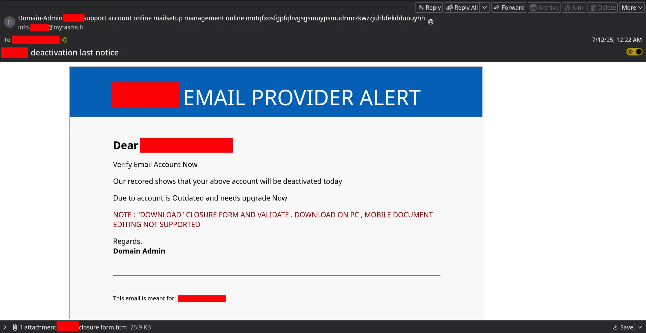 We are often targeted by phishing and spear-phishing. The fact that we accept cryptocurrency payments makes us an attractive target. One of our staff received the following email on July 12th: